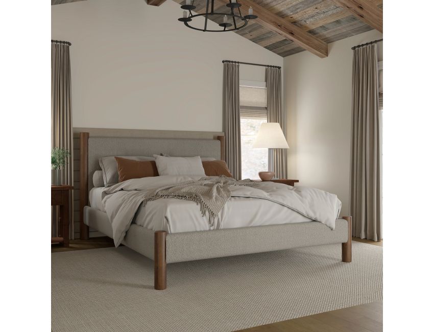 Urban Lodge meets Mid-century styling with this timeless bed. The solid wood posts are finished in a warm walnut. The two-toned mushroom colour of the texture fabric will work well with various décor themes and colours. Great for a primary bedroom or guest room, or at the cottage.