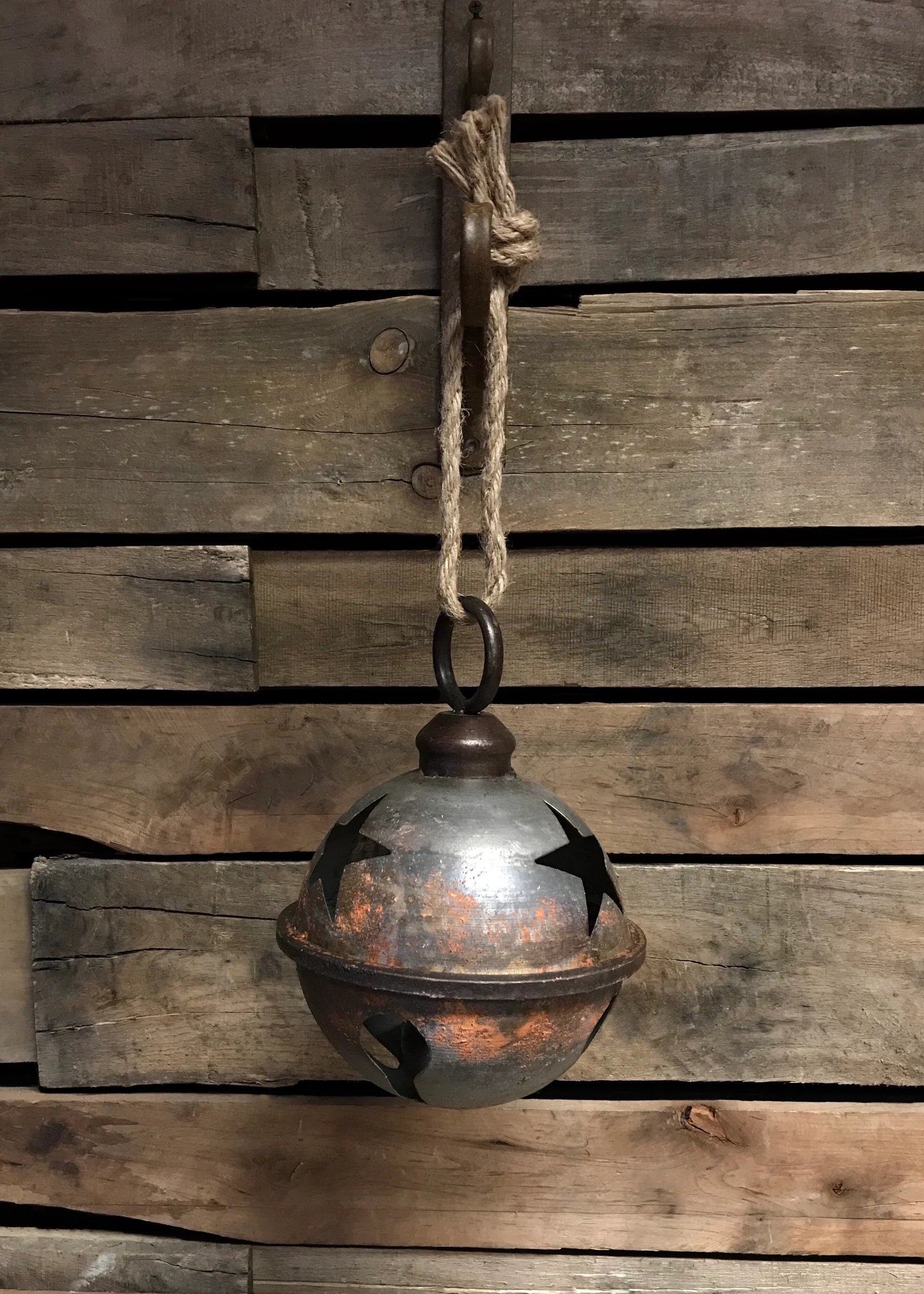 These vintage-style sleigh bells (7" diameter) bring rustic holiday charm with a jute hanging rope and four finishes: Antique white, Rusted pewter, Rustic Black, Rustic Brick Red.